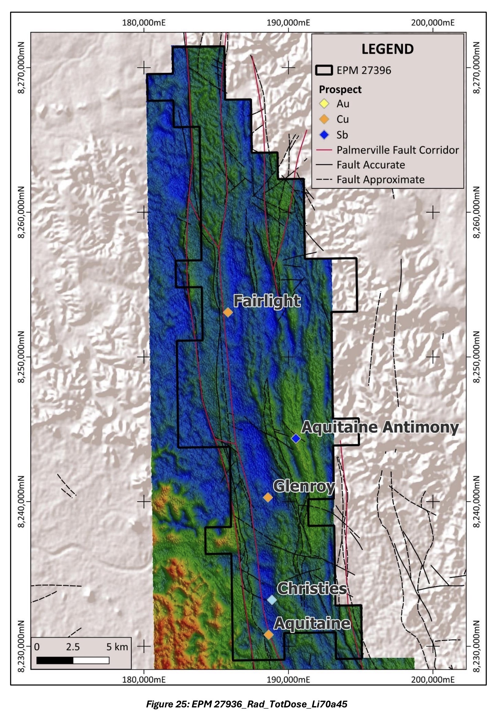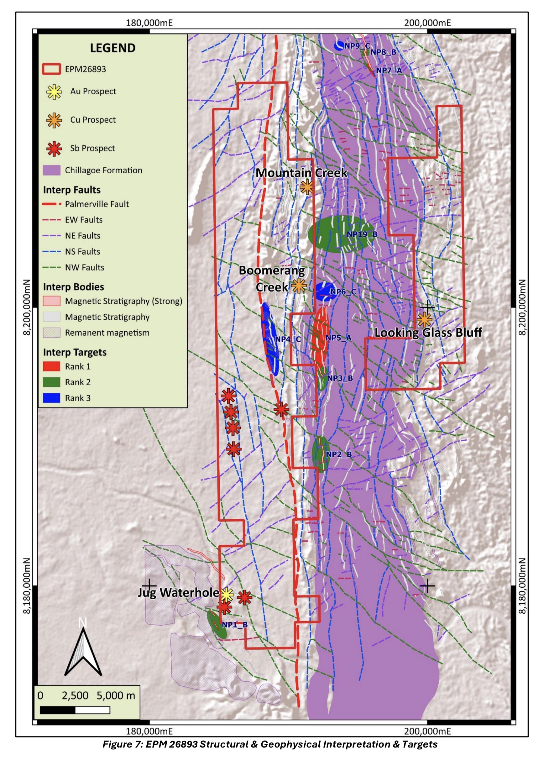 Thematic mapping of antimony in soils and stream samples delineated several anomalous trends coincident with fault structures and brecciated chert units interpreted as favourable bedrock targets. While this work pre-dates modern exploration methodologies, the spatial continuity and structural association of these anomalies provide strong evidence for antimony mineralisation within the Palmerville mineral system.