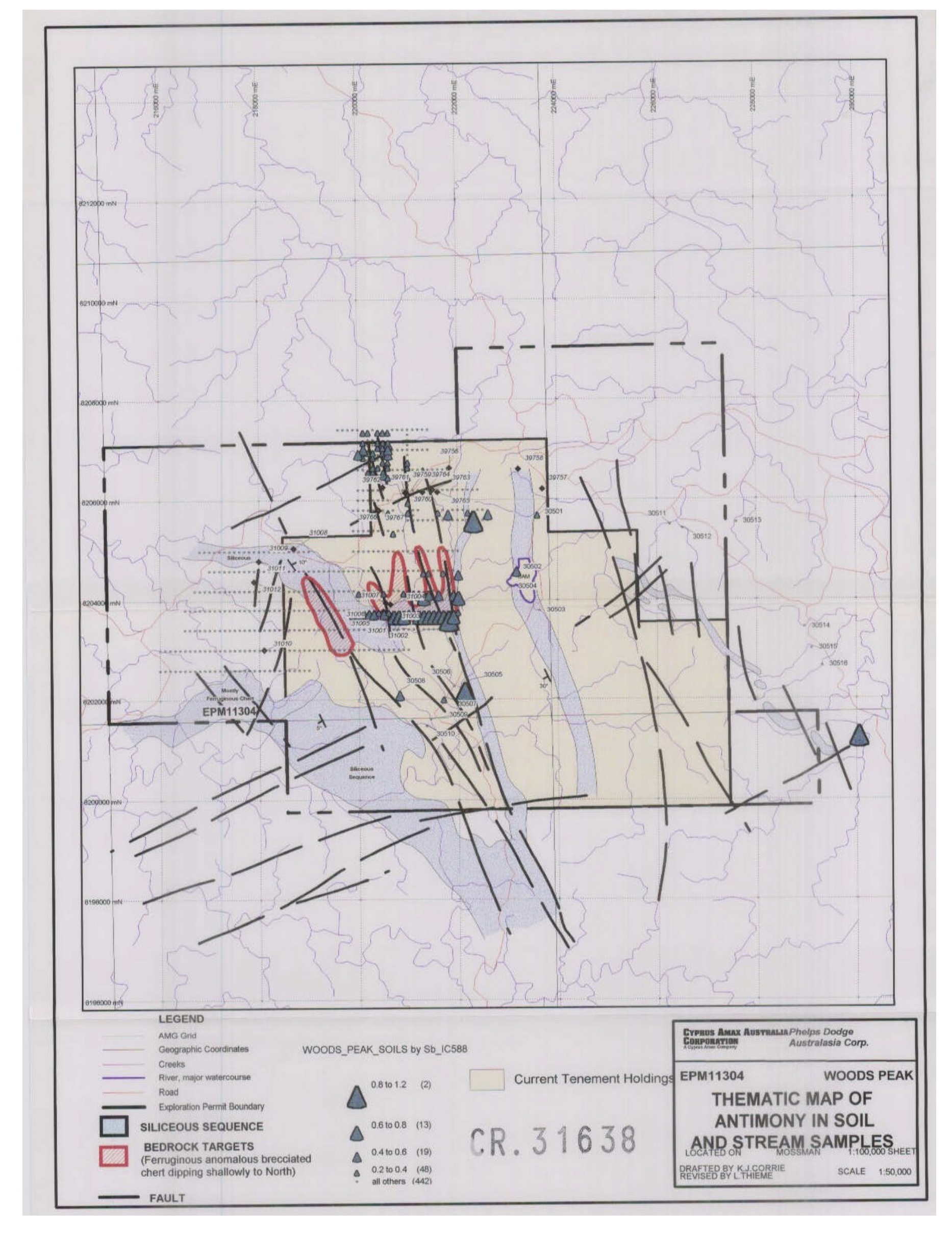 At Woods Peak (EPM 11304), soil and stream sediment sampling undertaken by Cyprus Amax Australia / Phelps Dodge Australasia Corp. identified coherent antimony anomalies associated with siliceous sequences and structurally controlled zones.