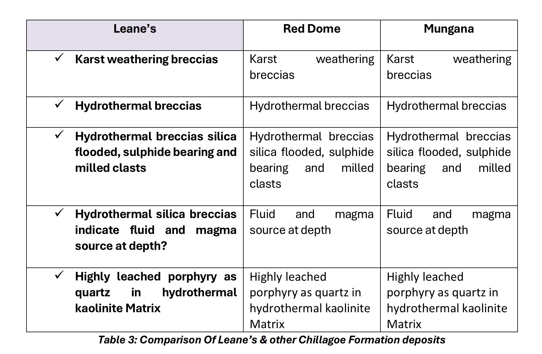 Many of these massive siliceous rocks so closely mimic the interpreted and mapped shallow thrusts, that they are almost certainly siliceous replacement bodies associated with these thrusts. However, some cherts and Tertiary rocks may represent massive silicification and diatreme breccias that, while frequently geochemically non-anomalous at surface, may be associated with gold and copper mineralisation at depth (Nethery, 1997).