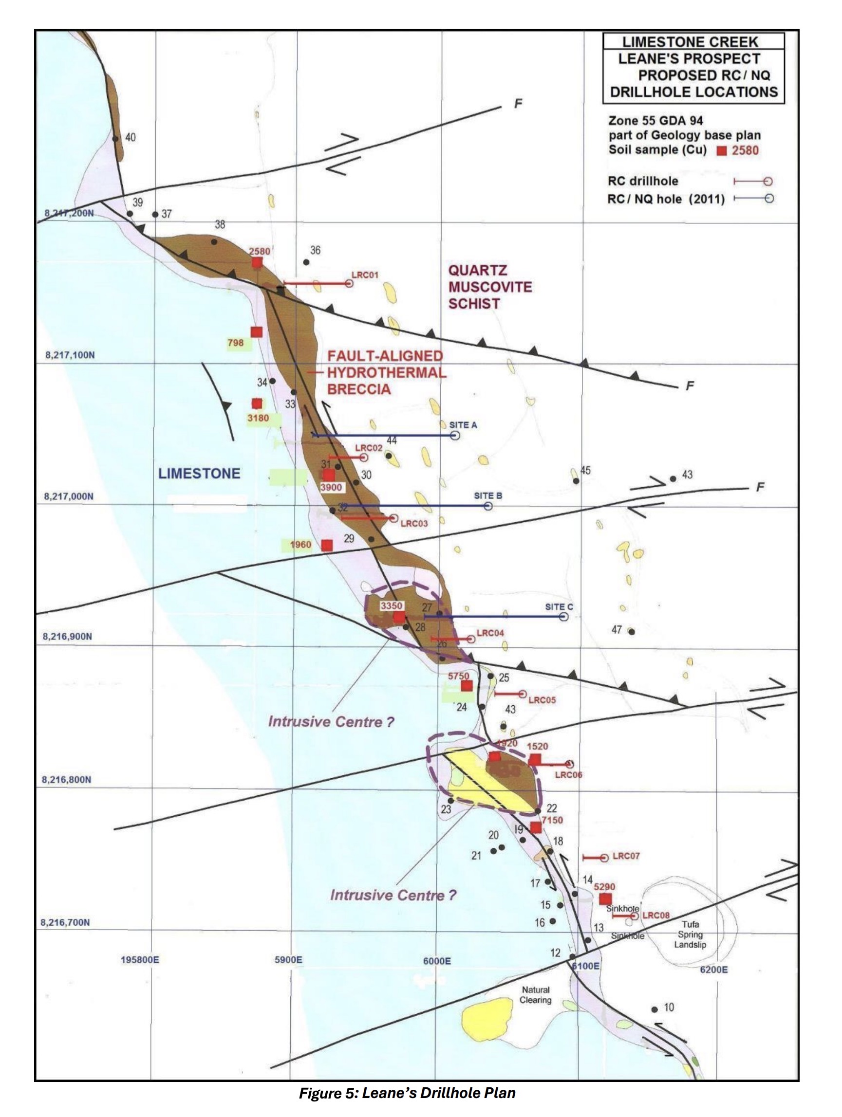 Five RC drillholes partially or fully tested the near-surface hydrothermal breccia mineralisation that sits below a strong linear copper-dominant soil anomaly. All holes intersected a ferruginous breccia horizon, as expected, associated with the contact between metasediments and limestone.