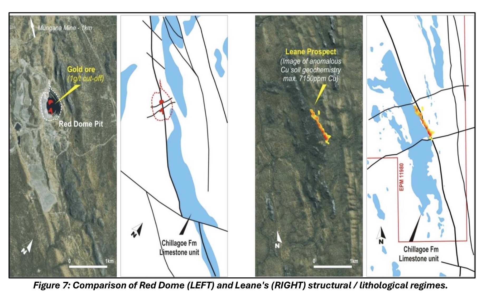 Glenroy Copper prospect which does not align with any of the known regional structural features as found in the Queensland Government geological database and is a possible tension fault which highlights a potential mineralised structure being present.