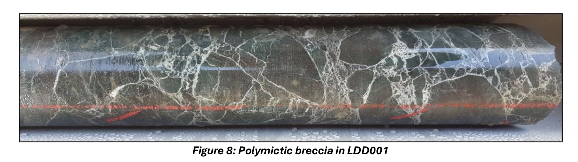these holes confirmed the validity of the model, with diamond hole LDD001 intersecting multiple intervals of polymictic breccia with silica-carbonate breccia infill and stockwork veining over a 40m