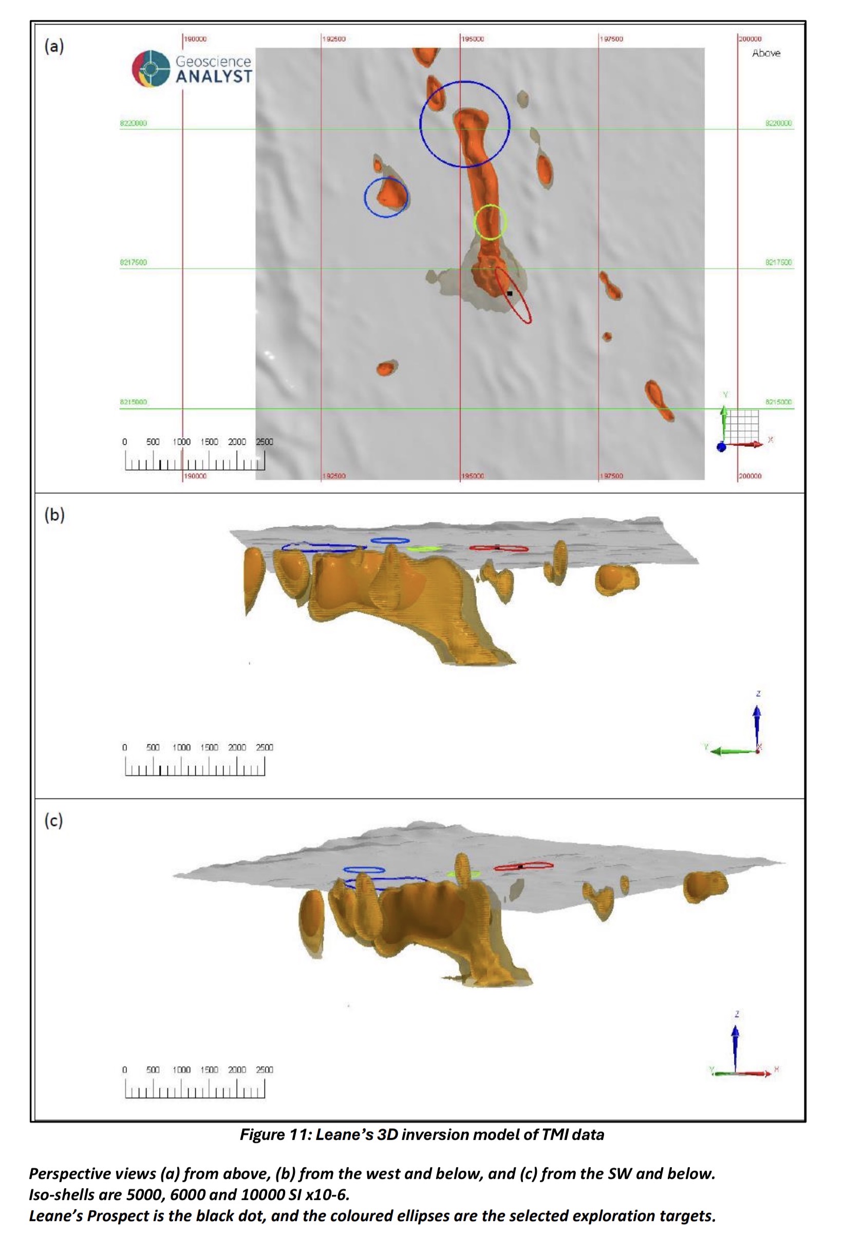 Results of the modelling are shown in Figure 10 and Figure 11 below, which show a narrow north south trending magnetic body that plunges down into a vertical body in the vicinity of Leane’s prospect (Figure 11)