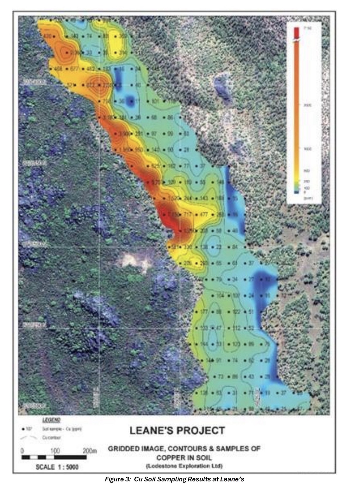 Subsequent exploration, including detailed soil geochemistry identified strongly anomalous copper over a 1,200m extent along a north-northwest trending brecciated contact between limestone to the west and siliciclastic sediments, plus locally meta-basalt to the east. In 2010, Lodestone completed a shallow 8 drill hole RC program to test the copper soil anomalies over a 500m strike length, plus two