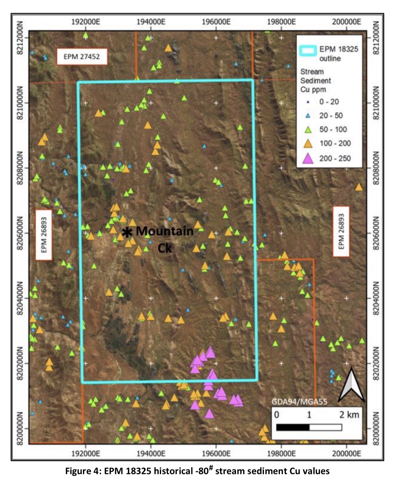stream sediment sampling confirmed weak anomalism in the Mountain Creek catchment (CR 5570). This regional stream sediment survey also identified a catchment in the upper Buffalo Creek with anomalous Cu values (consistently above 150 ppm (see Figure 4below) which was never followed up. Both tenements were surrendered after the first year.