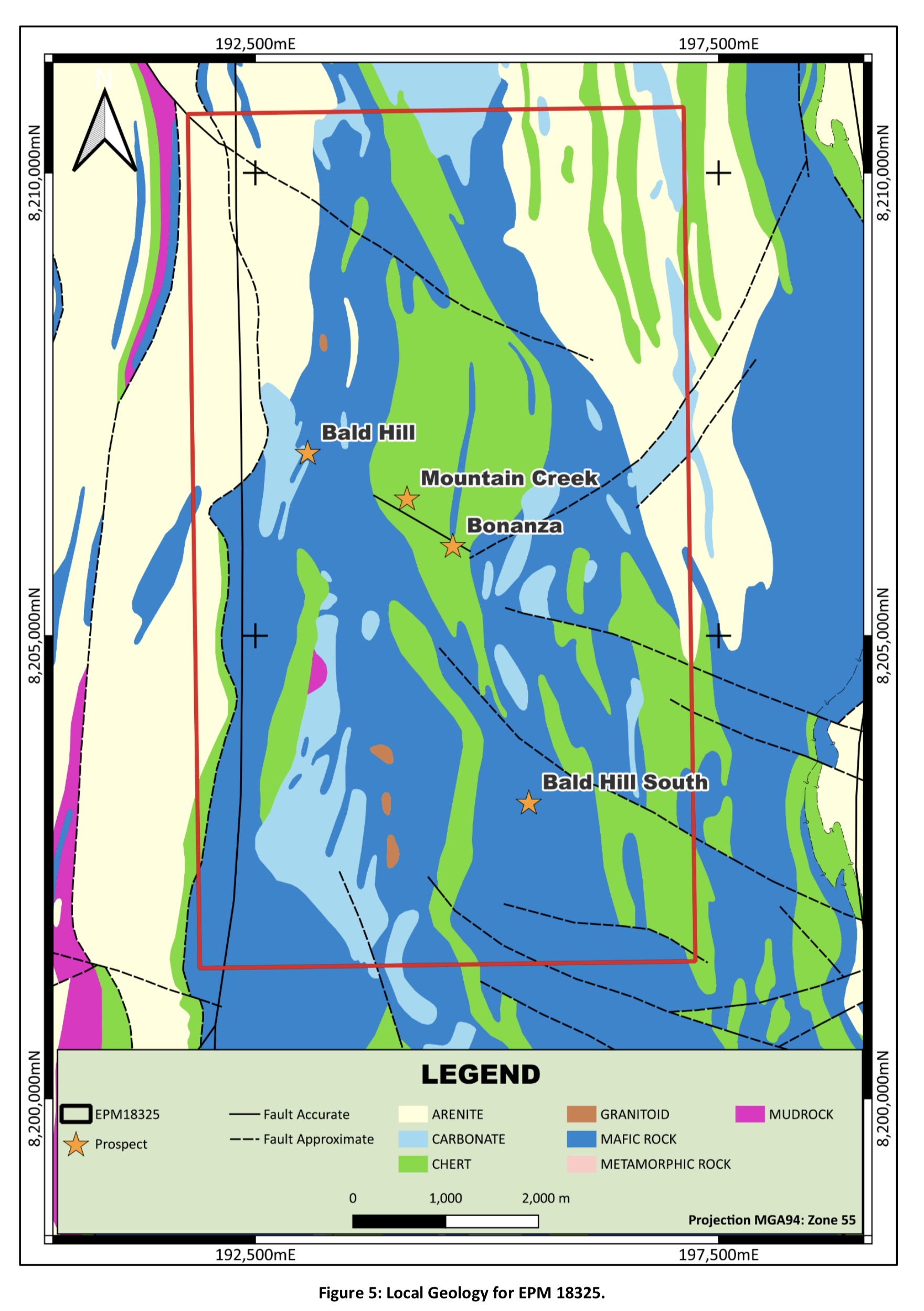 EPM 18325 lies within the Middle Palaeozoic Hodgkinson Province (represented by the Mulgrave, Chillagoe and Hodgkinson Formations) and is separated from the Middle Proterozoic Dargalong Metamorphics to the west by the Palmerville Fault, a major NNW trending structure.