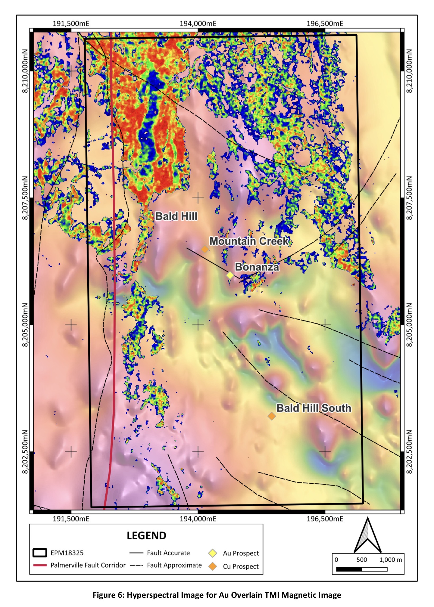 Figure 6 shows the hyperspectral image for gold overlaying the 2023 TMI magnetic image, highlighting the potential for gold mineralisation related to the Palmerville fault in the north-western corner of