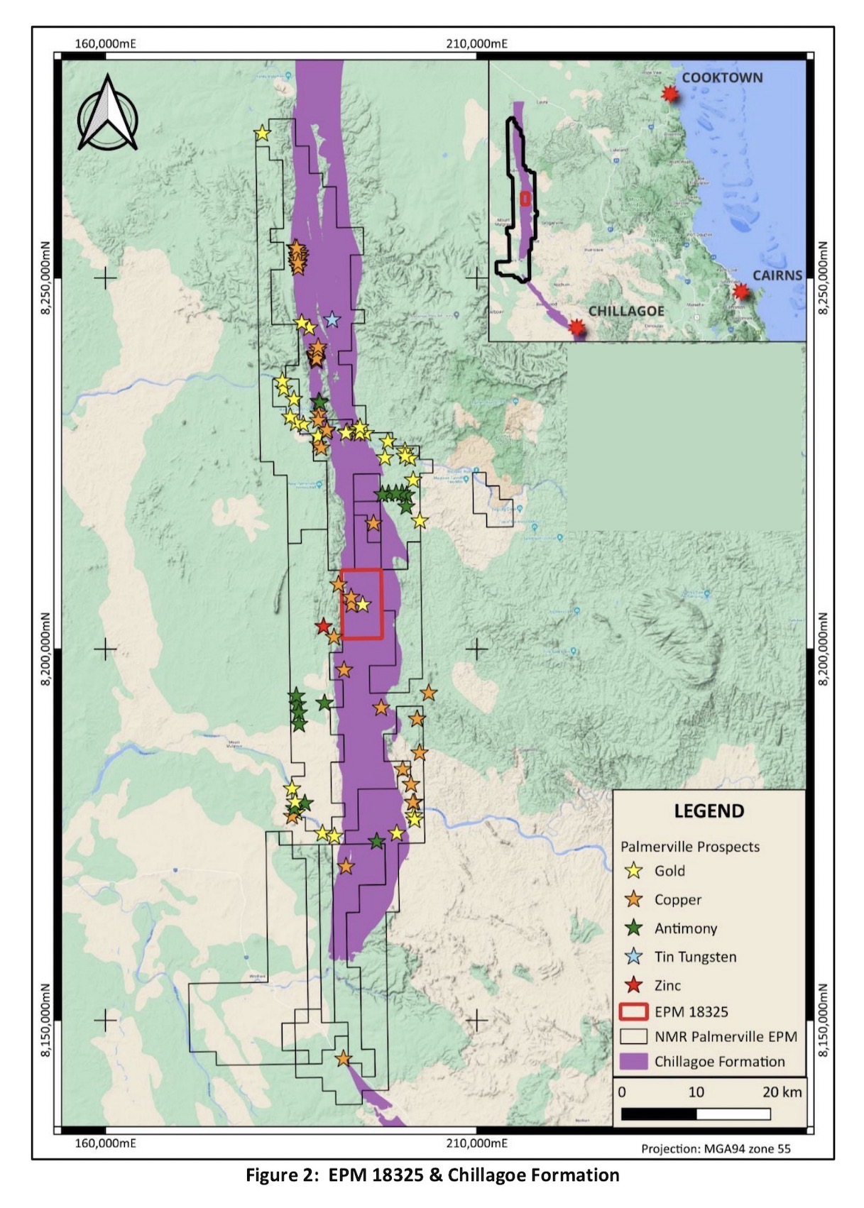 The Hodgkinson Province, which hosts the Chillagoe Project, consists of an early to middle Palaeozoic sedimentary sequence dominated by turbiditic rocks with subordinate limestone, chert, and basic volcanic rocks extending for ~500 km from Innisfail to Cape Melville and inland for ~150 km from the coast to the Palmerville Fault.