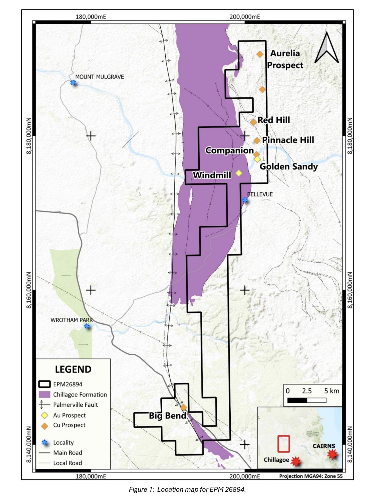 EPM 26894 is situated in the south-eastern portion of the Palmerville project and geologically it lies within the Paleoproterozoic Dargalong Metamorphics of the Yambo Sub-province (1,550Ma) which is represented by the Chelmsford Gneiss. The Chelmsford Gneiss is overlain by Quaternary alluvial deposits along most of the south and western sections of the tenement.