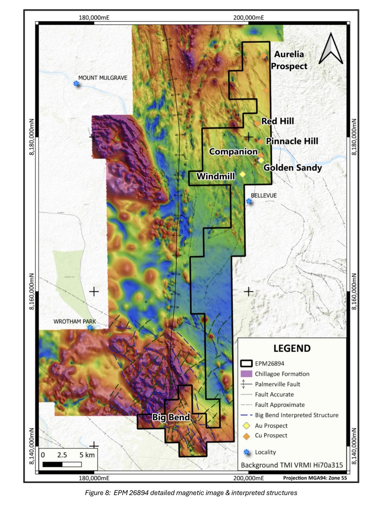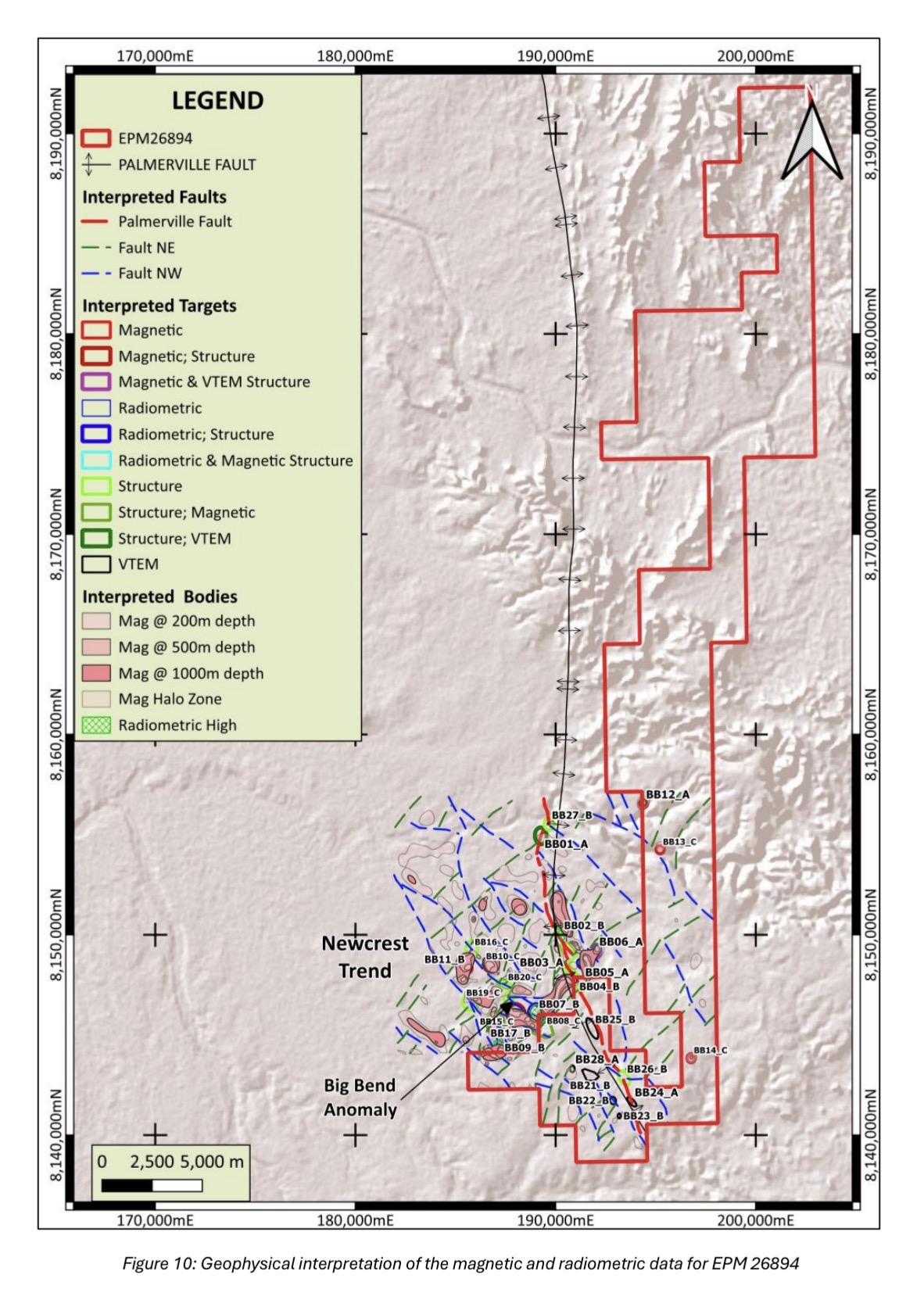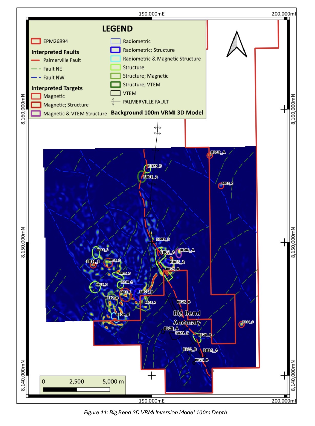 Initial reviews of the raw magnetic and radiometric geophysical data revealed a circular magnetic body located just north-west of the Big Bend anomaly in the western section of EPM 26894, though the follow up structural and geophysical interpretation did not find the magnetic structure to be a viable exploration target.