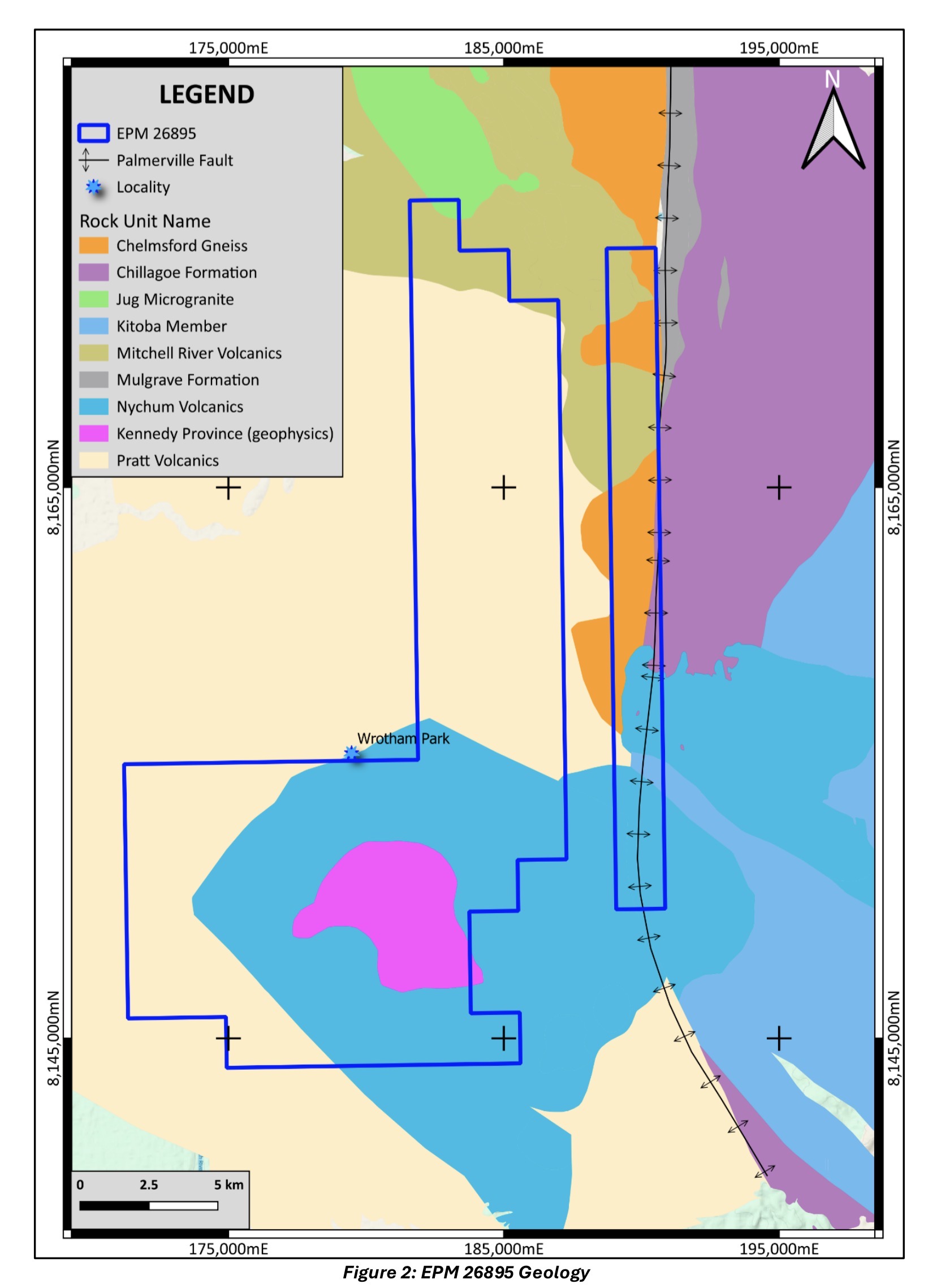 The southern portion of EPM 26895 is comprised of Nychum Volcanics, predominantly rhyolite lavas, andesite and dacites. Metalliferous occurrences elsewhere in the Chillagoe Formation are observed to be associated with basaltic volcanics.