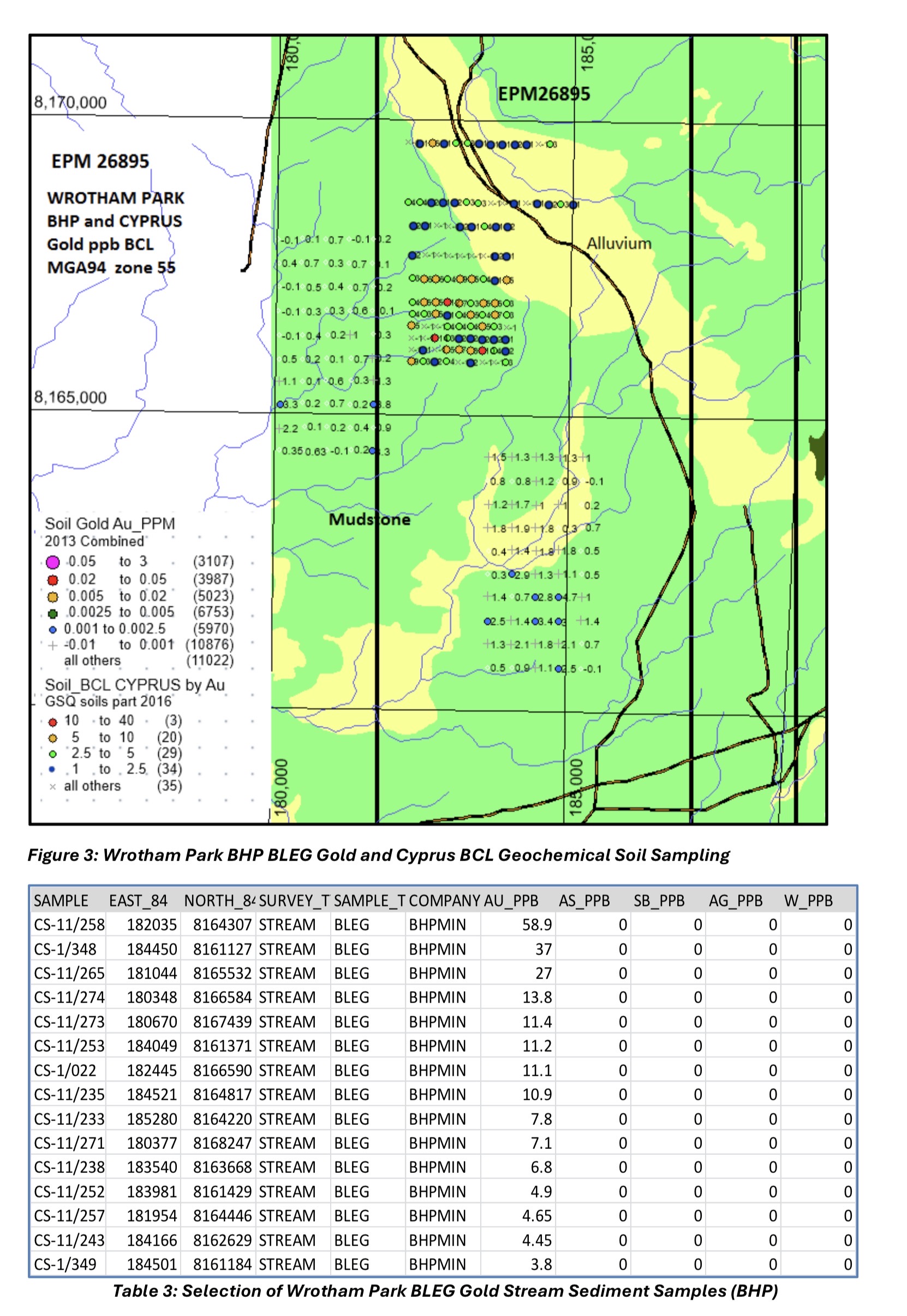 With the basin undergoing E-W shortening the main shears in the basin are N-W trending (South Palmerville, Retina, Hurricane and Konderparinga faults) with transverse sinistral movements of up to 10 km and in most cases host mineralisation. The Newcrest trend is a representative of these basement structures and hence prospective within the Proterozoic terrain. BHP and Cyprus Australia conducted stream sediment and soil sampling over parts of EPM 26895 and the recorded results showed weakly anomalous Au assays from BCL stream up to 57.9ppb Au (Figure 3 - Figure 5 and Table 3).