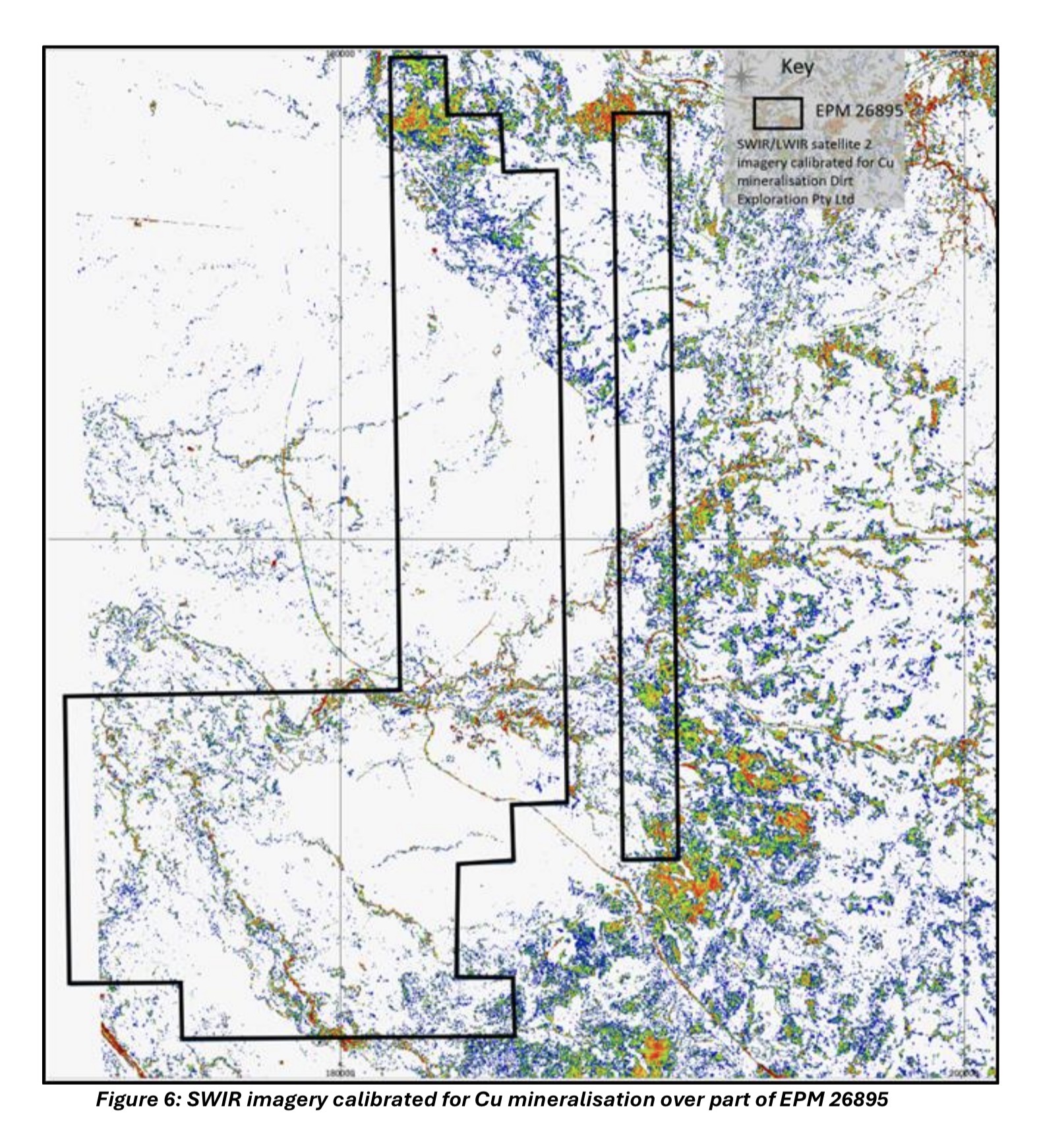 In 2021, NMR contracted Dirt Exploration to acquire and review the publicly available SWIR/LWIR Sentinel-2 satellite imagery and develop hyperspectral imagery maps for the potential for copper, gold and antimony in the regolith over the entire Palmerville project area (Figure 6).