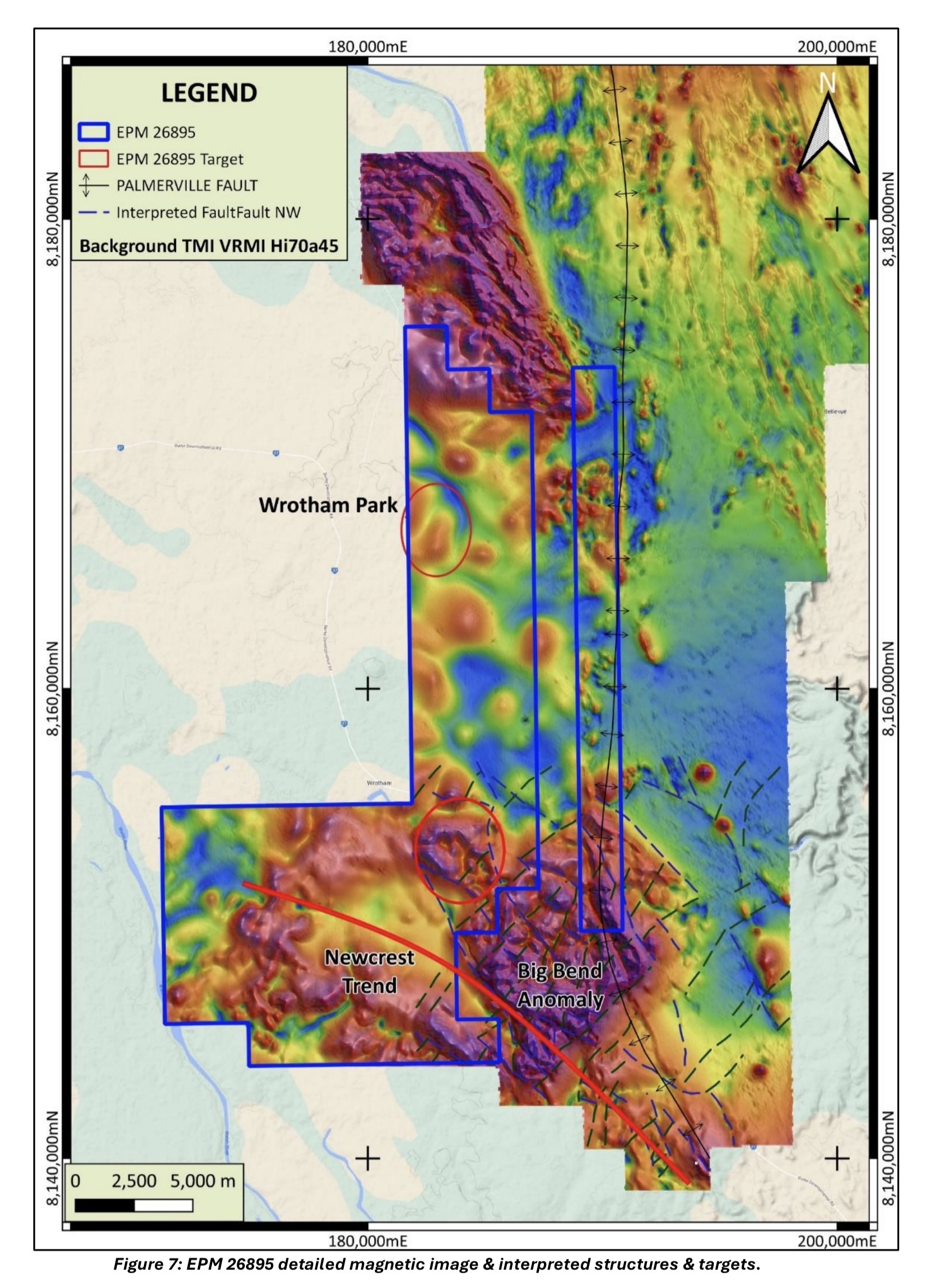 Figure 7 displays the airborne magnetic data, as a TMI VRMI image, over EPM 26895. Previous work in the area by Newcrest has highlighted a geophysical feature that extends in a relative straight line where the Palmerville faultflexes to the north and is followed by the Chillagoe Formation.
