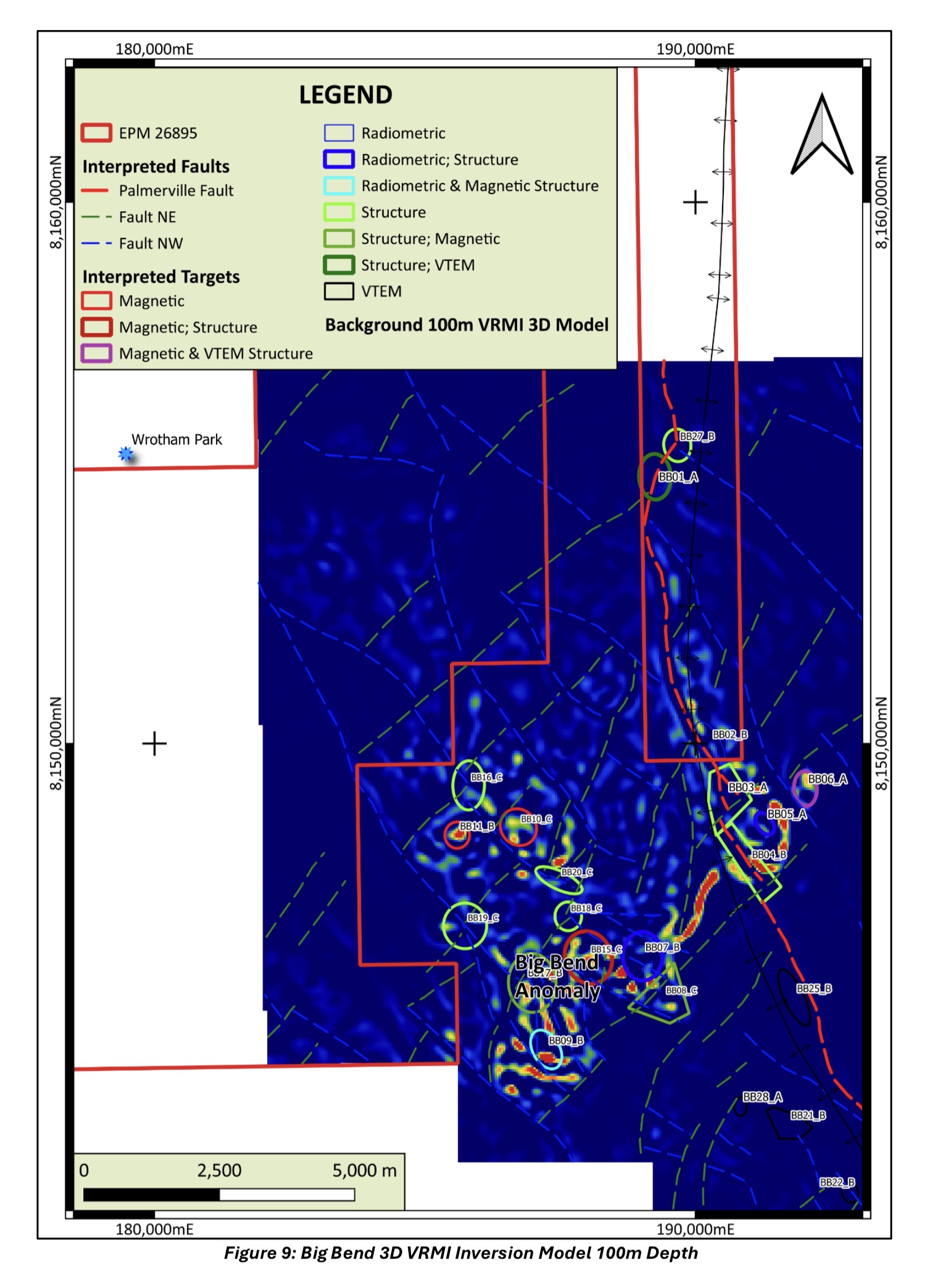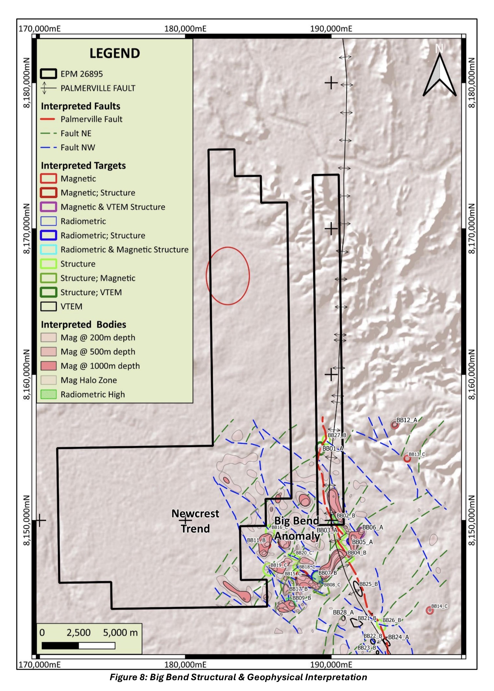 Initial reviews of the raw magnetic and radiometric geophysical data revealed a circular magnetic body located just north-west of the Big Bend anomaly in the western section of EPM 26895, though the follow up structural and geophysical interpretation did not find the magnetic structure to be a viable exploration target.