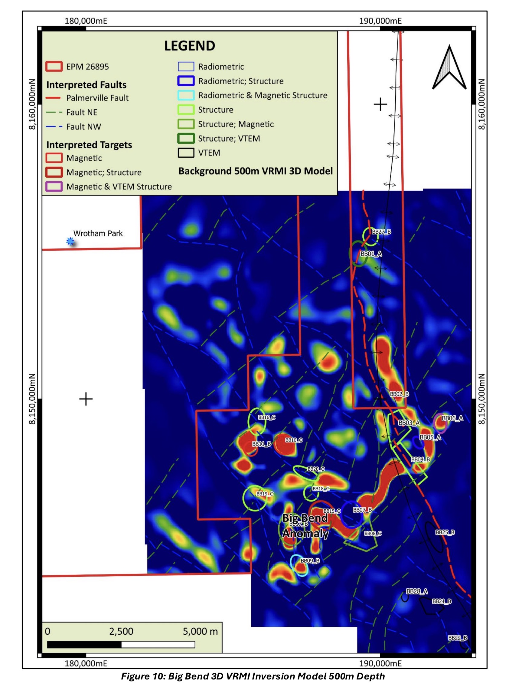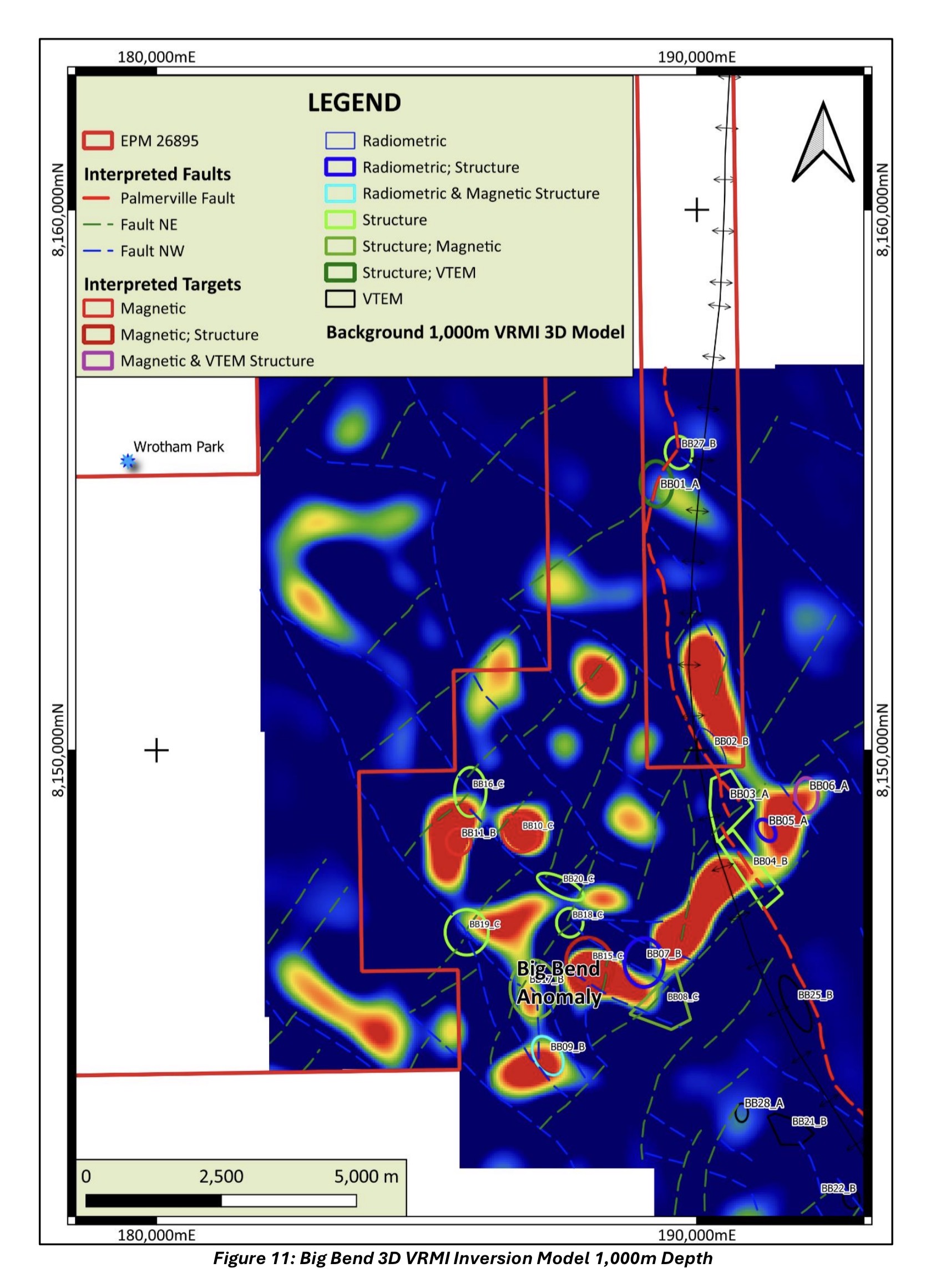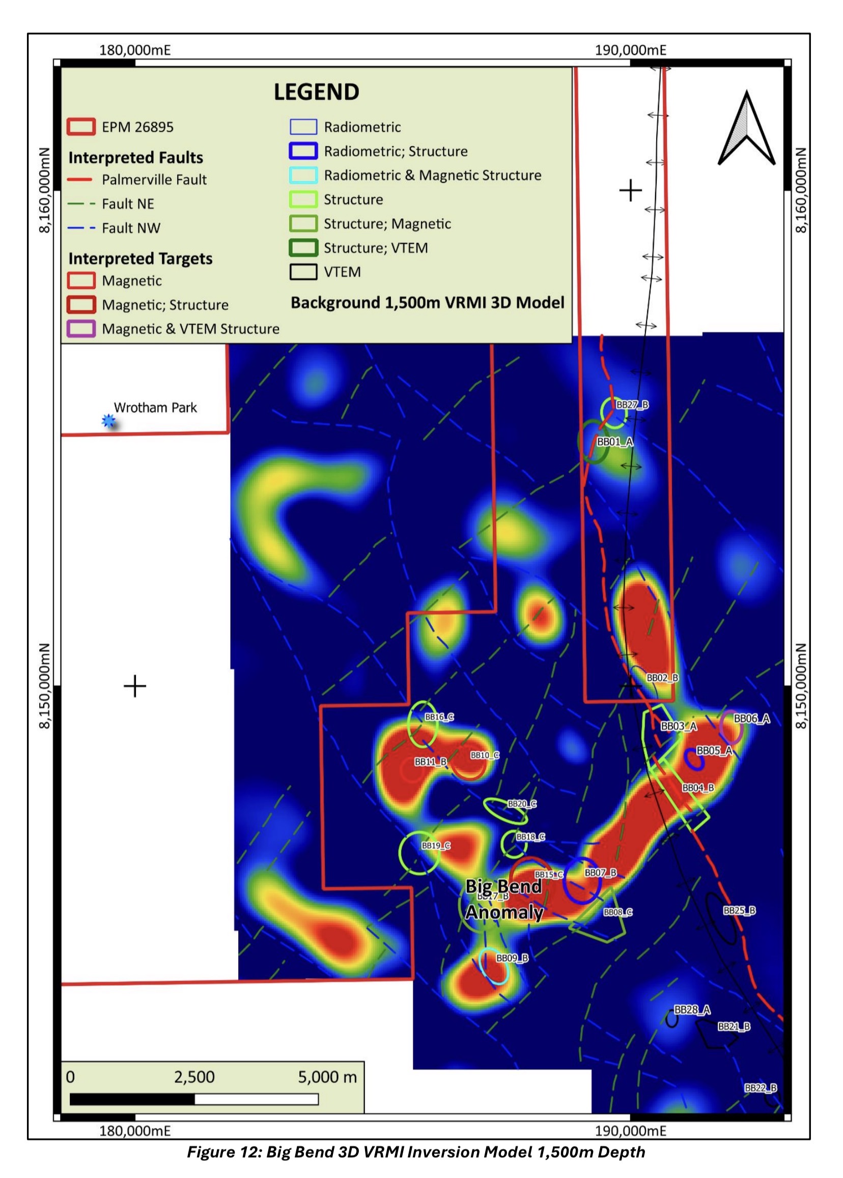 The interpretation also identified a large magnetic anomaly located just north of Big Bend anomaly and to the west of EPM 19537 that shows a large structural displacement, most likely faulting, that develops in intensity with depth, as shown in the VRMI 3D magnetic inversion model to at least a depth of 1,5000 metres (Figure 9 - Figure 12).