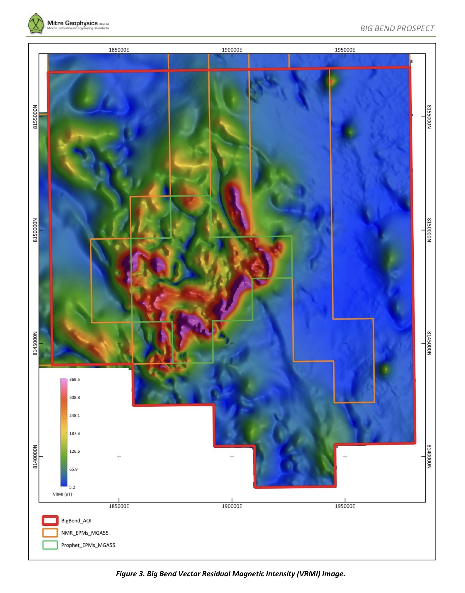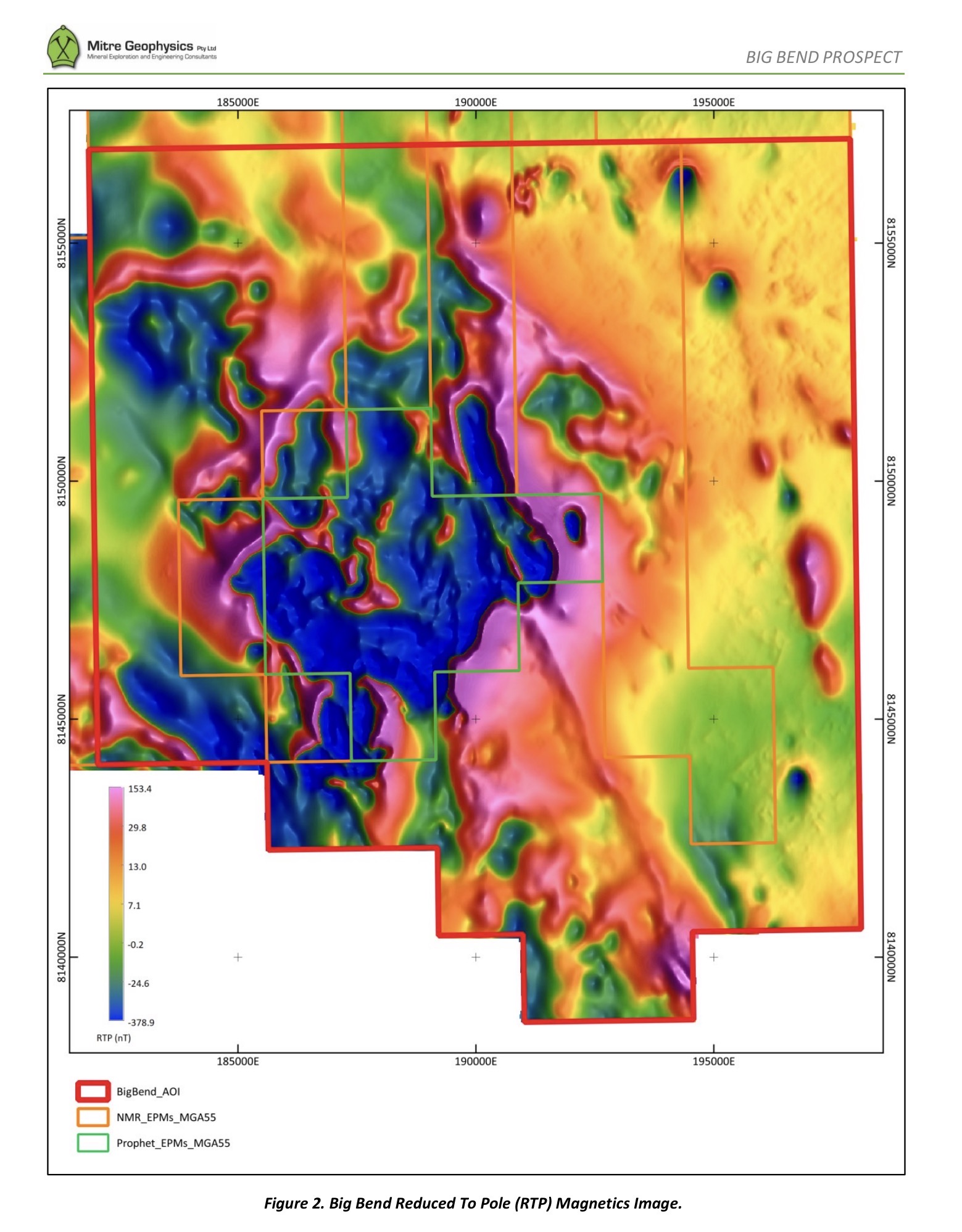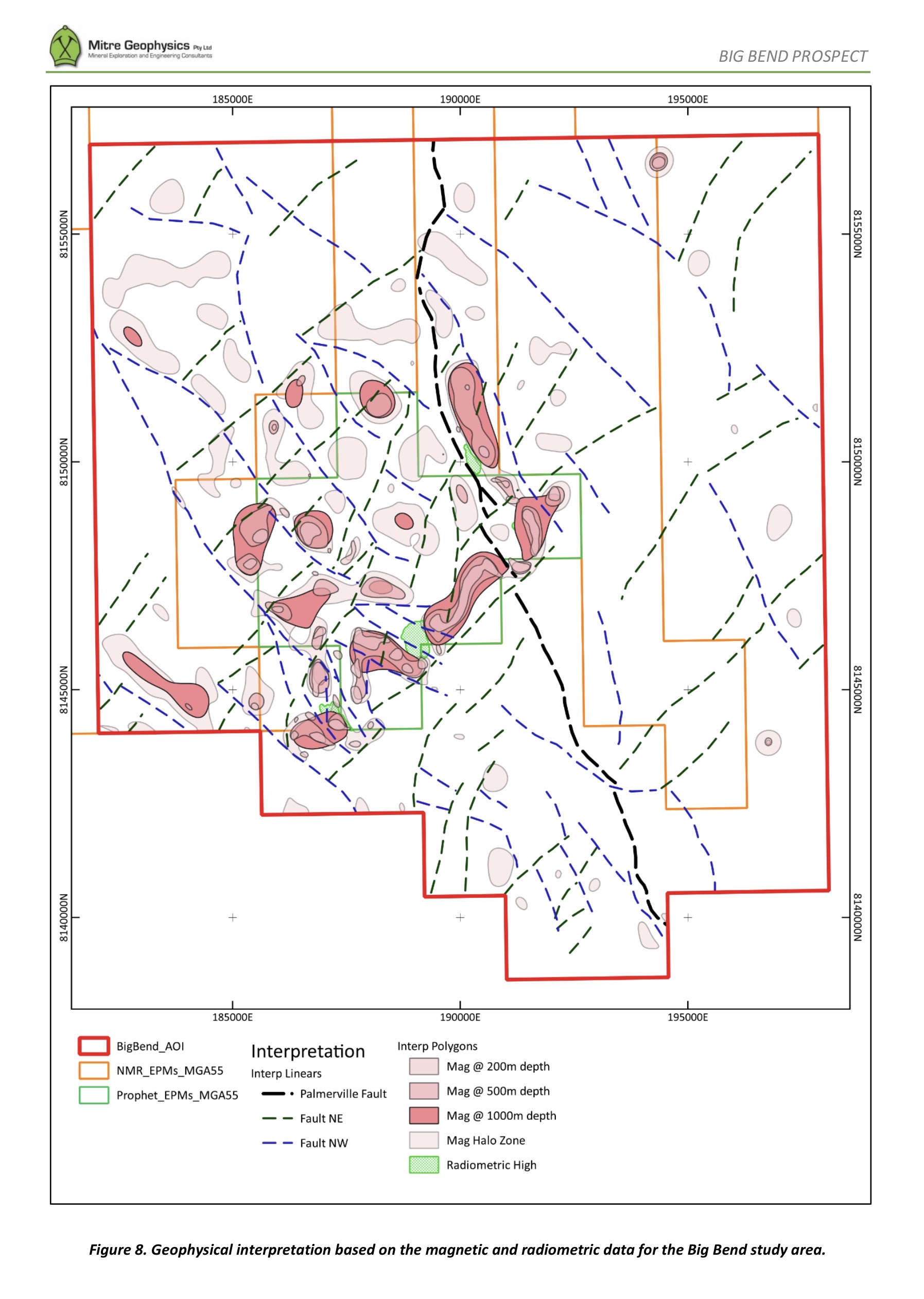 The airborne magnetics at Big Bend clearly define a diamond shaped zone of complex magnetic responses with bounding structures in the NE and NW directions. This is seen clearly in the VRMI (Figure 3) and Analytic Signal images (Figure 4). There are also numerous NE and NW structures cutting across and through the magnetic zone. The interpretation of this signature is fairly straight-forward with the complex likely to be due to magnetic intrusive rocks which have been subsequently deformed by the NE and NW structures. The age of the intrusives is likely to be Late Carboniferous to Early Permian indicated by the presence of reverse remanent magnetisation.