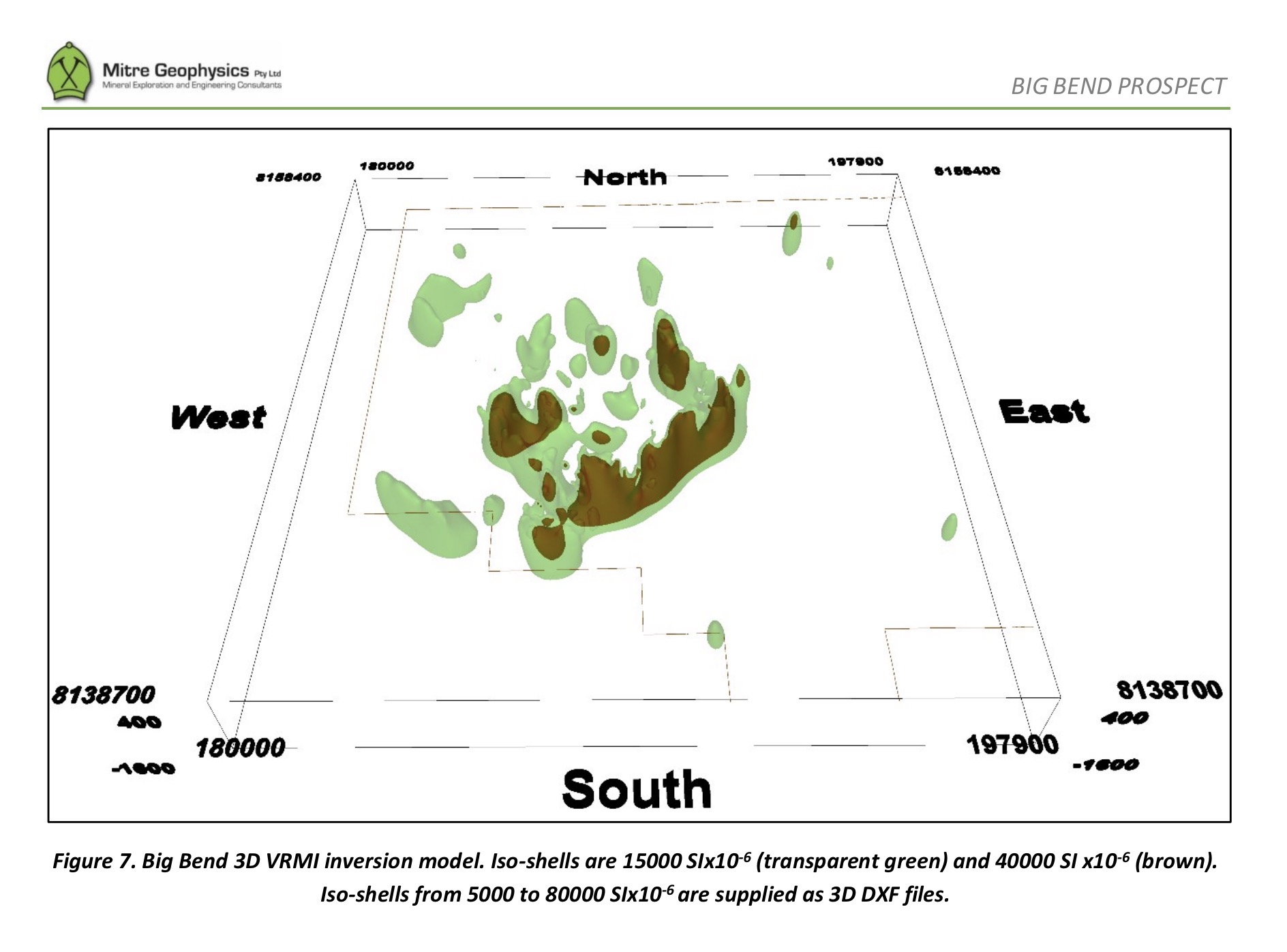 The inversion results are presented as a depth slice at 300m below the surface through the 3D model in Figure 6. Depth slices from 100m to 1500m depth are also provided as GeoTIFF images with this report. A 3D perspective view of two selected iso-shells derived from the 3D inversion model is presented in Figure 7. A full range of iso-shells are also provided as 3D DXF files for display in any 3D software.