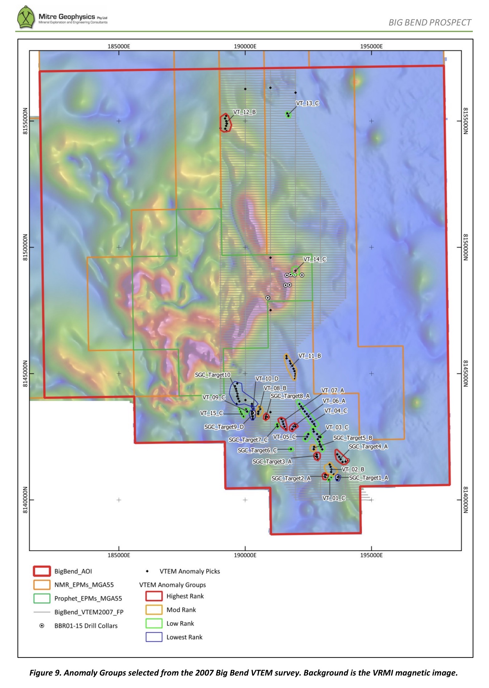 Conceptual exploration targets have been selected for the Big Bend area based on the magnetic, radiometric and VTEM data, and the geophysical structural interpretation presented in Section 3.3.