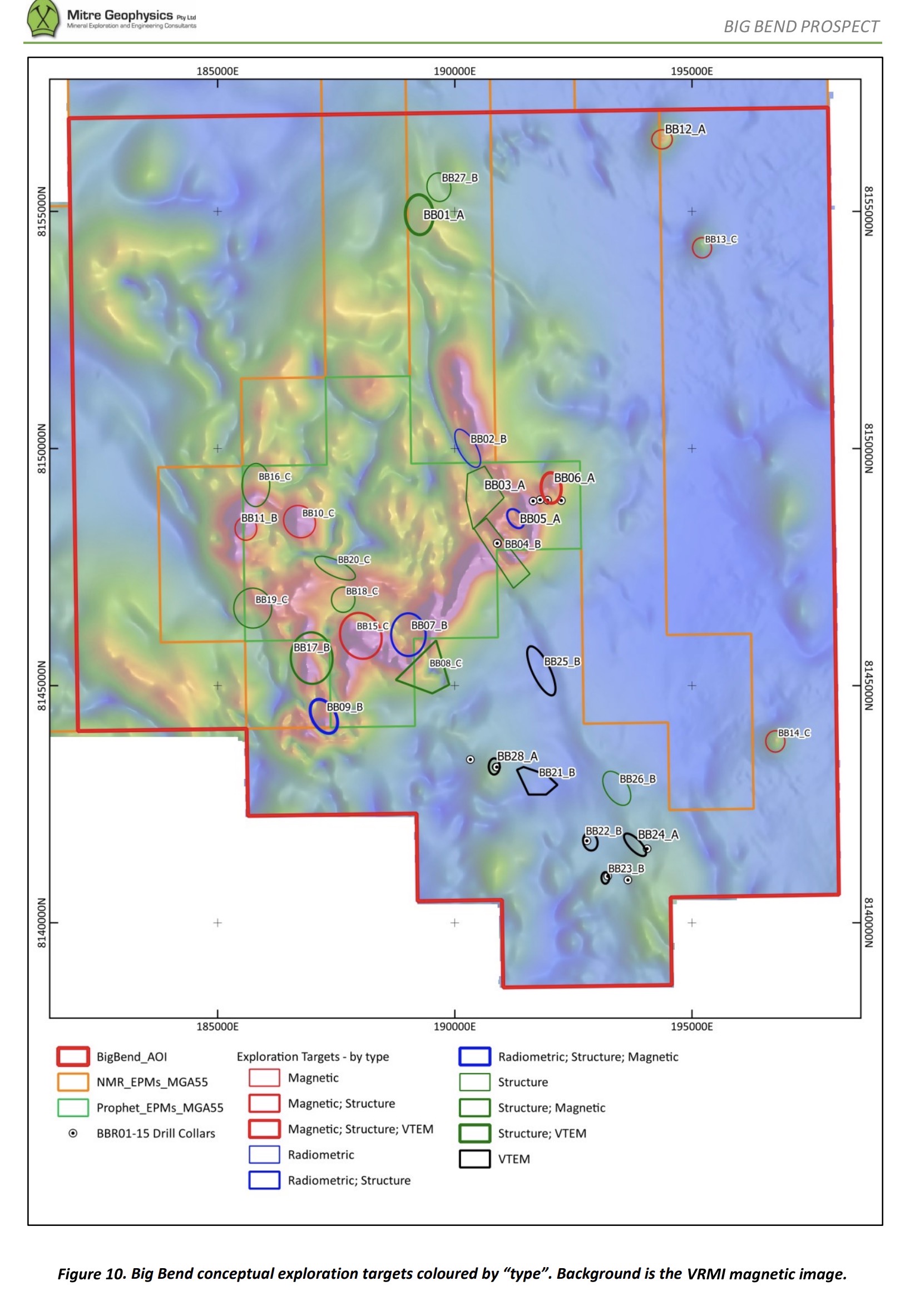 The exploration target areas are identified by a name and a ranking. The name is a unique identifier which in this case is BBxx (xx being a number). The ranking is a letter from A (highest ranking) to C (lowest ranking). Targets with coincident structural and geophysical anomalism are generally ranked highly, while the more conceptual targets with less confidence are ranked lower.